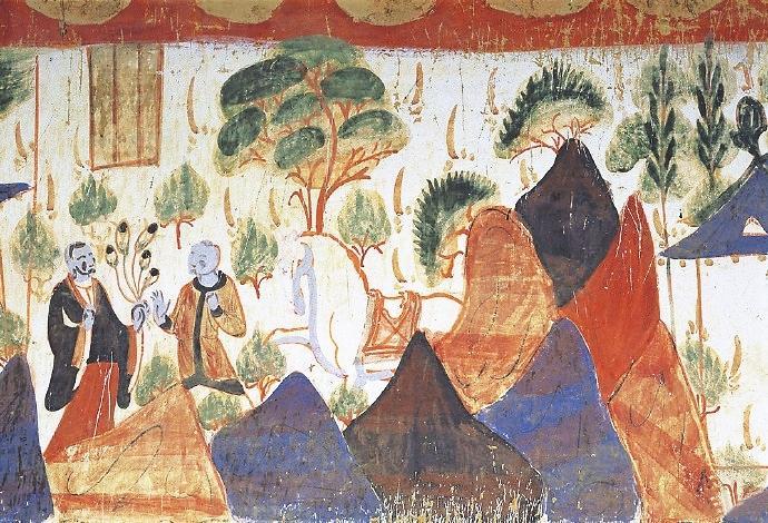 在敦煌壁畫中有關(guān)對(duì)弈的內(nèi)容較多。在莫高窟第454窟、第7窟壁畫中都有“弈棋圖”。兩幅圖的畫面有不少類似的地方:一是畫師較為突出棋盤的位置,兩幅壁畫中的棋盤都居中且形制相對(duì)巨大;二是畫面上的人物均為三人,兩人對(duì)弈,一人觀戰(zhàn),“觀棋不語真君子”;三是對(duì)弈者身后的景色都是天朗氣清、遠(yuǎn)山含黛。據(jù)說,一天,北宋大文豪蘇東坡與摯友黃庭堅(jiān)正在松樹底下弈棋。一陣風(fēng)吹來,松果掉進(jìn)棋盤。蘇東坡隨即吟道:“松下圍棋,松子每隨棋子落。”黃庭堅(jiān)馬上回答道:“柳邊垂釣,柳絲常伴釣絲懸。”雅趣十足。其實(shí),棋局里的一動(dòng)一靜、一招一式無不需要謹(jǐn)小慎微、穩(wěn)扎穩(wěn)打。而對(duì)弈時(shí)的當(dāng)斷則斷、示假隱真、有效合作等戰(zhàn)術(shù)不僅是對(duì)弈的智慧,也是人生的哲理吧。