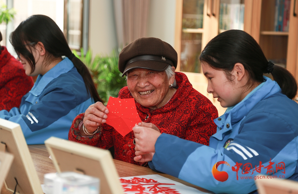 學(xué)生志愿者為老人們贈送剪紙作品