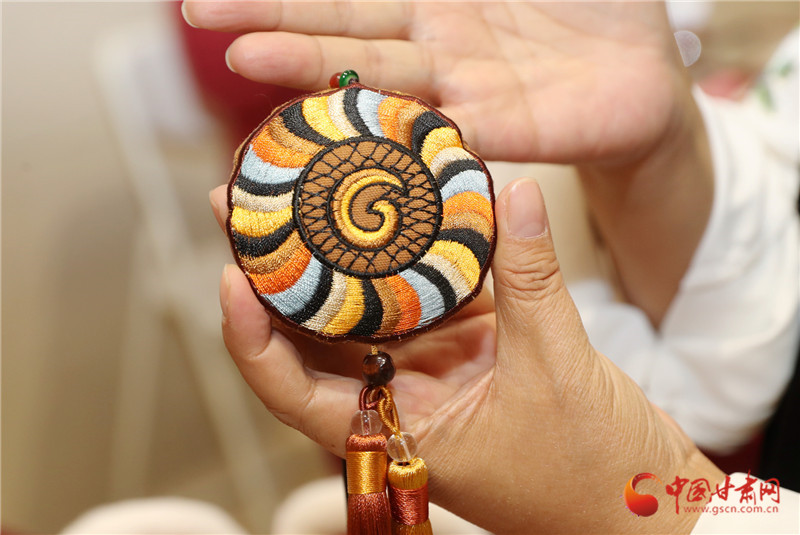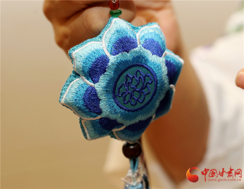 甘肅省博物館非遺集市的展臺(tái)前,包雨蕾的敦煌藻井香包一亮相就攥住了人的目光——青綠色絲線繞出的蓮瓣層層疊疊,中心飛天剪影隨腳步輕晃,清雅檀香混著花草香漫開(kāi)來(lái)。這款光是飛天飄帶針?lè)ň妥聊チ艘粋€(gè)月的新作,藏著她的心思:用慶陽(yáng)香包的針腳,把甘肅的千年文脈繡進(jìn)當(dāng)下生活。