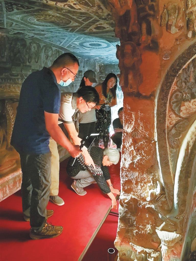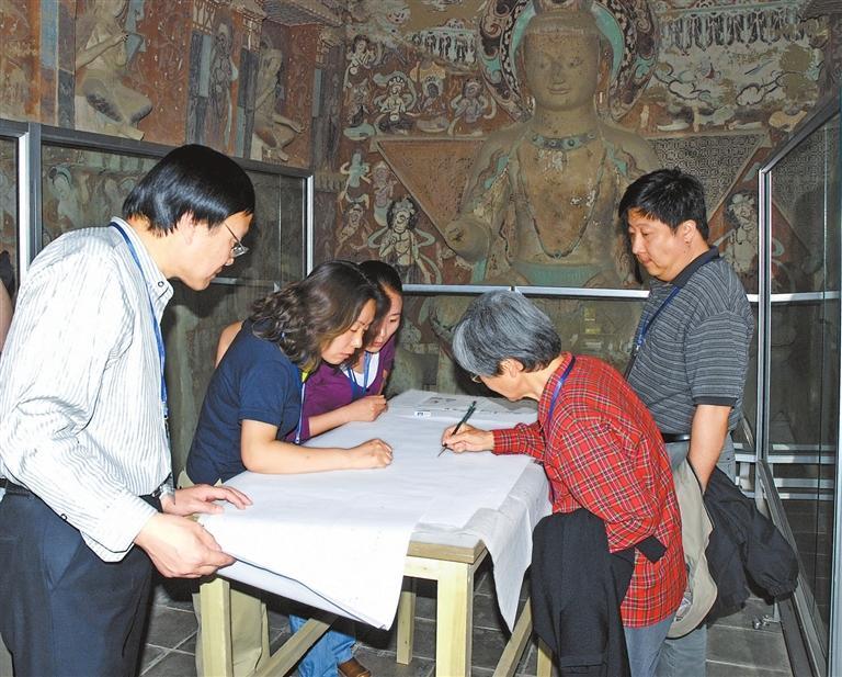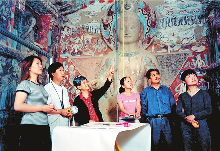 樊錦詩(shī)帶領(lǐng)項(xiàng)目團(tuán)隊(duì)在莫高窟第275窟核對(duì)石窟考古報(bào)告測(cè)繪圖。