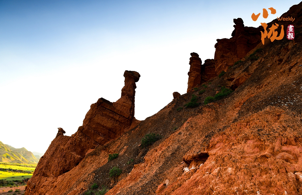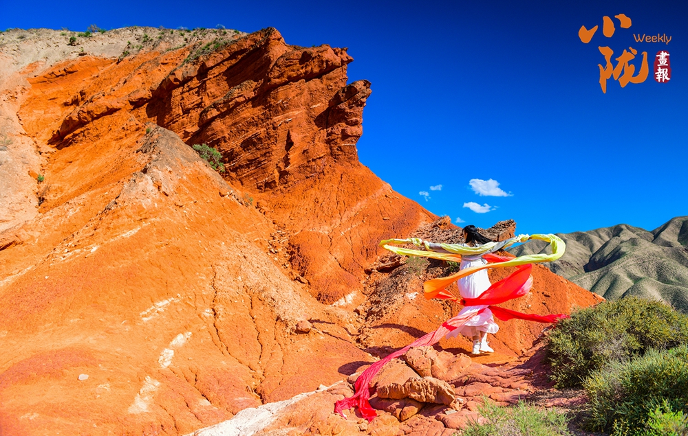 極目遠(yuǎn)眺,丹霞丘陵在廣袤的黃土高原上奔騰不息,猶如一座座火焰山。朱砂紅如烈焰燃燒,赭石黃似大地厚土,青黛綠若幽谷深潭,間或夾雜著沉穩(wěn)的灰褐,共同編織出一種難以言喻的斑斕與和諧。