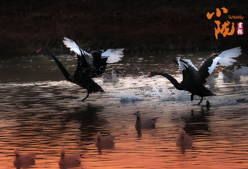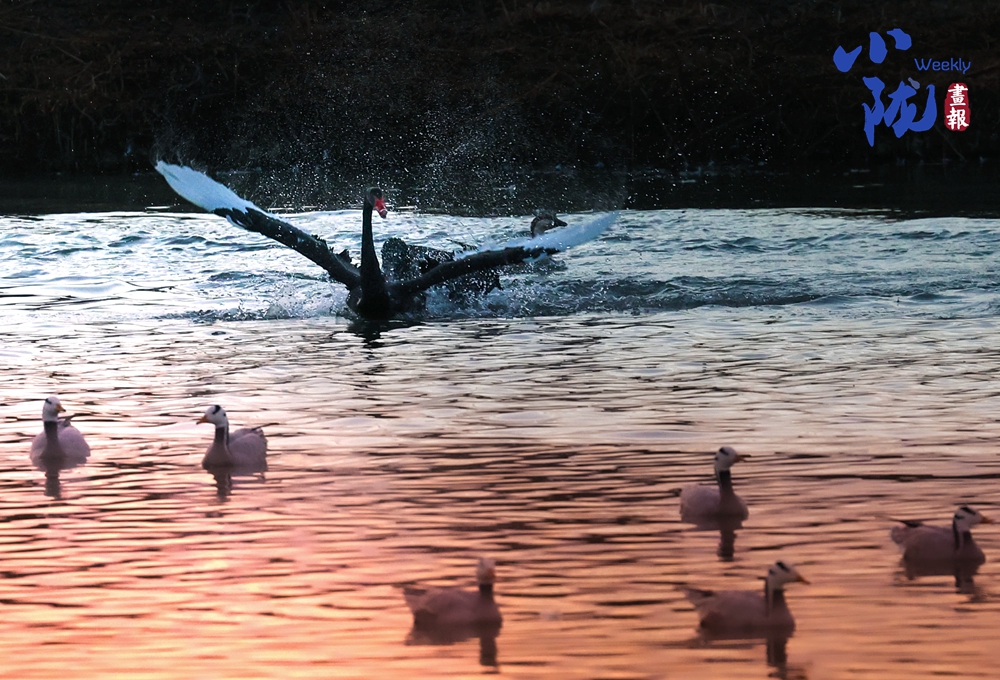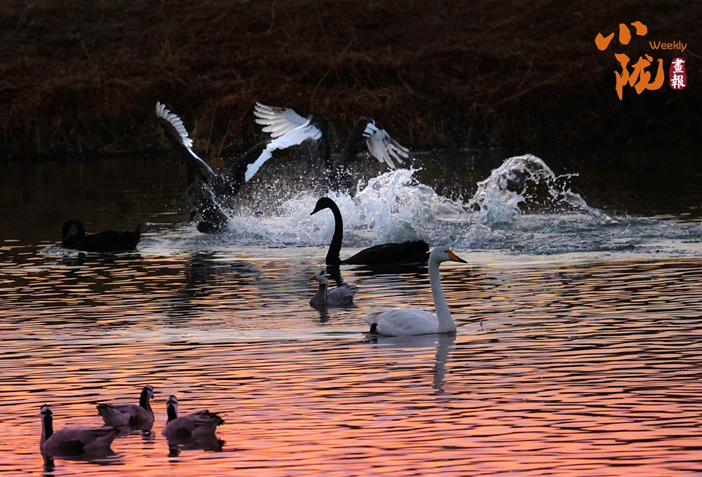 這里聚集了黑鸛、白鷺、鴛鴦、天鵝、赤麻鴨、灰雁等多種水鳥,它們?cè)邳S昏里愜意地游弋,或扎進(jìn)水里捕魚,或相互追逐戲水的畫面,既震撼又溫柔,成為攝影愛好者和游人爭(zhēng)相追逐的“冬日奇景”。