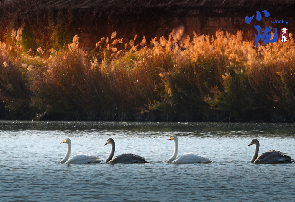 各類水鳥迎風(fēng)掠起,或引頸長(zhǎng)鳴,或振翅嬉戲,在冰雪、蘆葦、藍(lán)天的映襯下,綽綽神姿、飄飄清影,舞出一幅和美靈動(dòng)的生態(tài)畫卷。