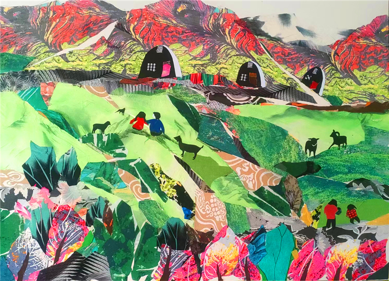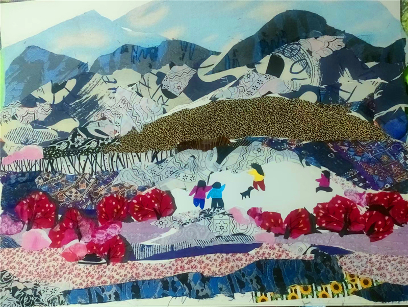裁剪環(huán)節(jié)更見(jiàn)功力。她以“銳利”之心駕馭剪刀,根據(jù)畫面需求將碎布剪成不同形狀,有的需棱角分明,有的要圓潤(rùn)柔和。粘貼時(shí),她摒棄簡(jiǎn)單的粘合方式,采用傳統(tǒng)縫補(bǔ)與現(xiàn)代鑲嵌相結(jié)合的技法,讓布料與底板緊密貼合,既保證了作品的耐久性,又營(yíng)造出自然的浮雕感。在《黃土風(fēng)情》布貼畫中,她用層層疊疊的碎布表現(xiàn)黃土高原的溝壑縱橫,用深淺不一的色塊勾勒窯洞的錯(cuò)落有致,指尖翻飛間,碎布頭便有了筋骨與神韻。