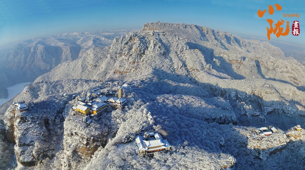 群山裹素,起伏的線條在極致湛藍(lán)的天穹下舒展,積雪壓彎枝頭,形成道道玉弧。而點(diǎn)綴其間的廟宇樓閣,默然佇立,飛檐上的殘雪泛著微光,與這片寧?kù)o的藍(lán)白色調(diào)共同構(gòu)成一幅和諧、安詳?shù)男麓貉┚啊?/p>