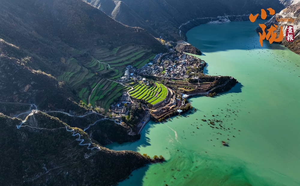 和煦的陽光傾灑而下,白龍江凝結的冰面宛如一塊巨大的天然翡翠,溫潤而晶瑩。它并非孤立存在,而是以一種寧靜而包容的姿態(tài),溫柔地環(huán)繞著、守護著岸上那些升起炊煙的村舍。